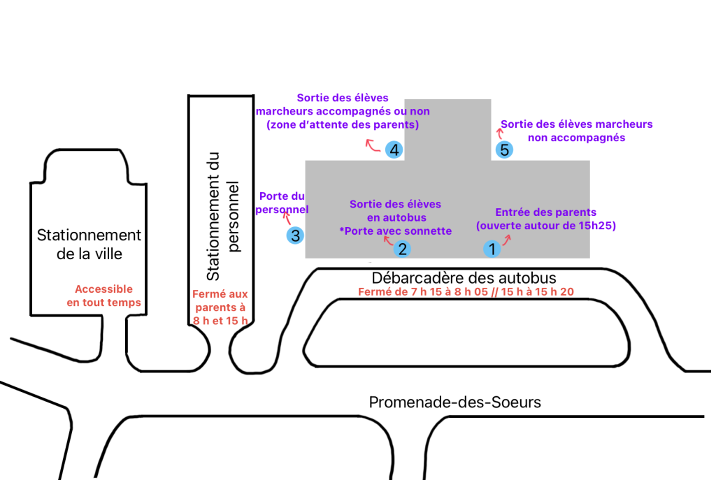 - Les parents qui récupèrent leur(s) enfant(s) en voiture ou au service de garde doivent entrer par la porte 1 (porte du service de garde). Celle-ci sera débarrée après le départ des autobus (autour de 15 h 25).