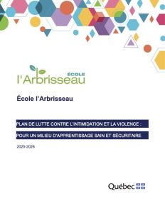 Chaque école doit avoir un plan de lutte pour prévenir l’intimidation et la violence. Celui-ci est adopté par le conseil d’établissement de l’école. Voici la nouvelle version du plan de lutte de l’Arbrisseau adopté en octobre 2025. Vous pouvez le consulter en cliquant sur l’image ci-dessous. L’école doit également remettre aux parents un document explicatif à l’intention des parents.